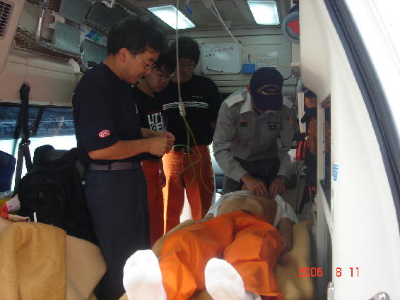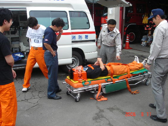 ついで、外に出て、救急車の救命作業の説明・実習に入りました。
