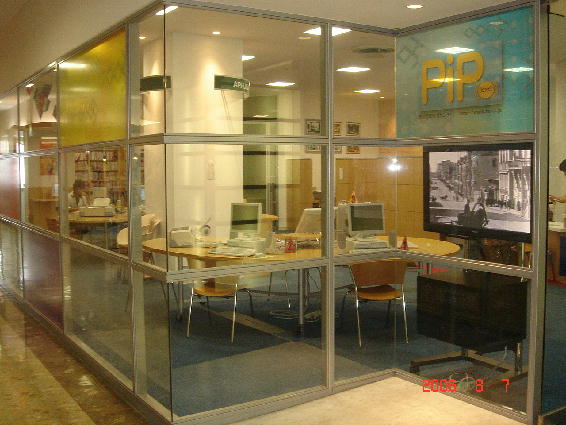 ピッピの外観。ガラス張りのパソコンコーナーです。市民の方々にパソコンを中心とするITやAVの機器を開放し、体験していただくための設備です。