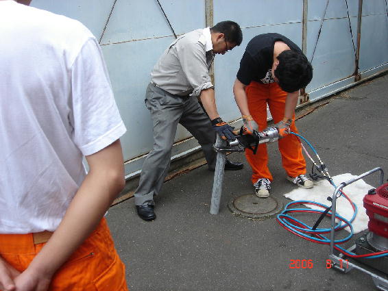 緊急医療用だけではなく、さまざまな脱出救助用の工具類の説明を受け、そのうちのいくつかは試用させてもらえます。これはS君が緊急救助用のパイプカッターを実習しているところです。ぶ厚いパイプなどを切るときは、反動で逆にこちら側の体がねじ倒されそうになるらしいです。