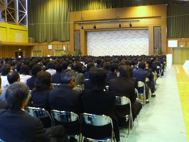 開式前の、会場全景です。前の方が学科別に並んだ卒業生。後ろが保護者席です。