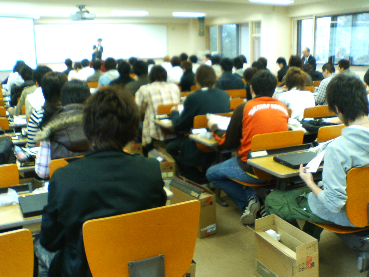 各学科の学生は3カ所のPCラボ室に別れ、指示に従って開梱、起動確認、保険契約書記入などを行いました。明日はいよいよ Windows Vista のインストールです。