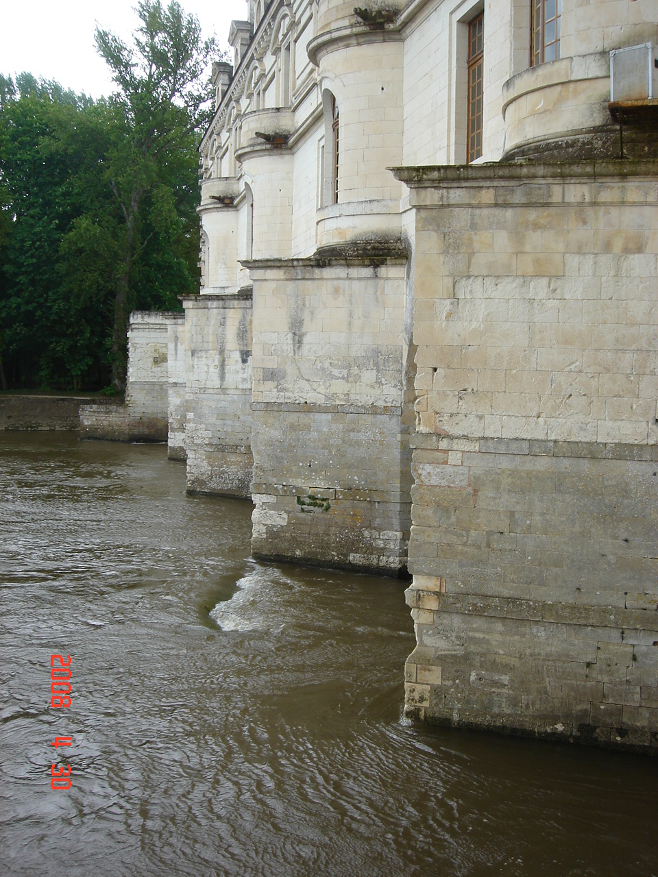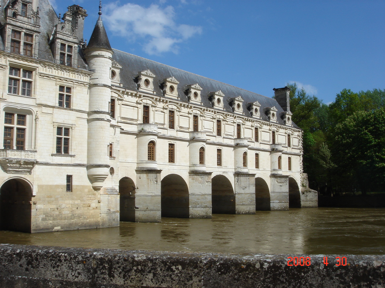 近くに寄ってみると、お城の基礎部分はこういう風に、川の中にあります。このシェール川は、ロワール渓谷の、ロワール川の支流だそうです。城の第1層はギャラリーとなっていますが、向こう岸にも通じる橋の上に作らせたのだそうです。向こう岸への出口の扉にはルネッサンス様式の暖炉が装飾についています。見ているはずなのですが、写真に撮っていず、記憶にもありません。