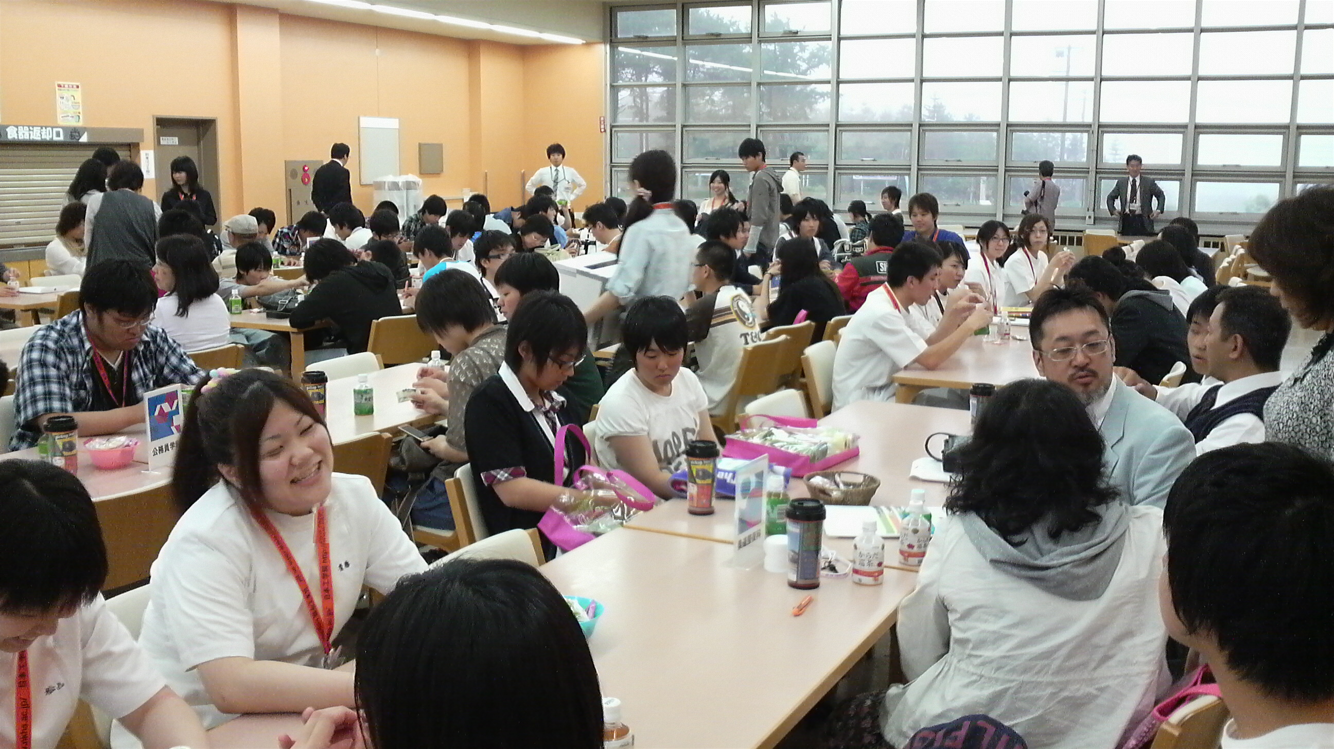 左の写真は、オープンキャンパスの一日のスケジュールが終わった後、リラックスタイムを食堂で過ごしている様子です。ほっとした雰囲気があふれています。