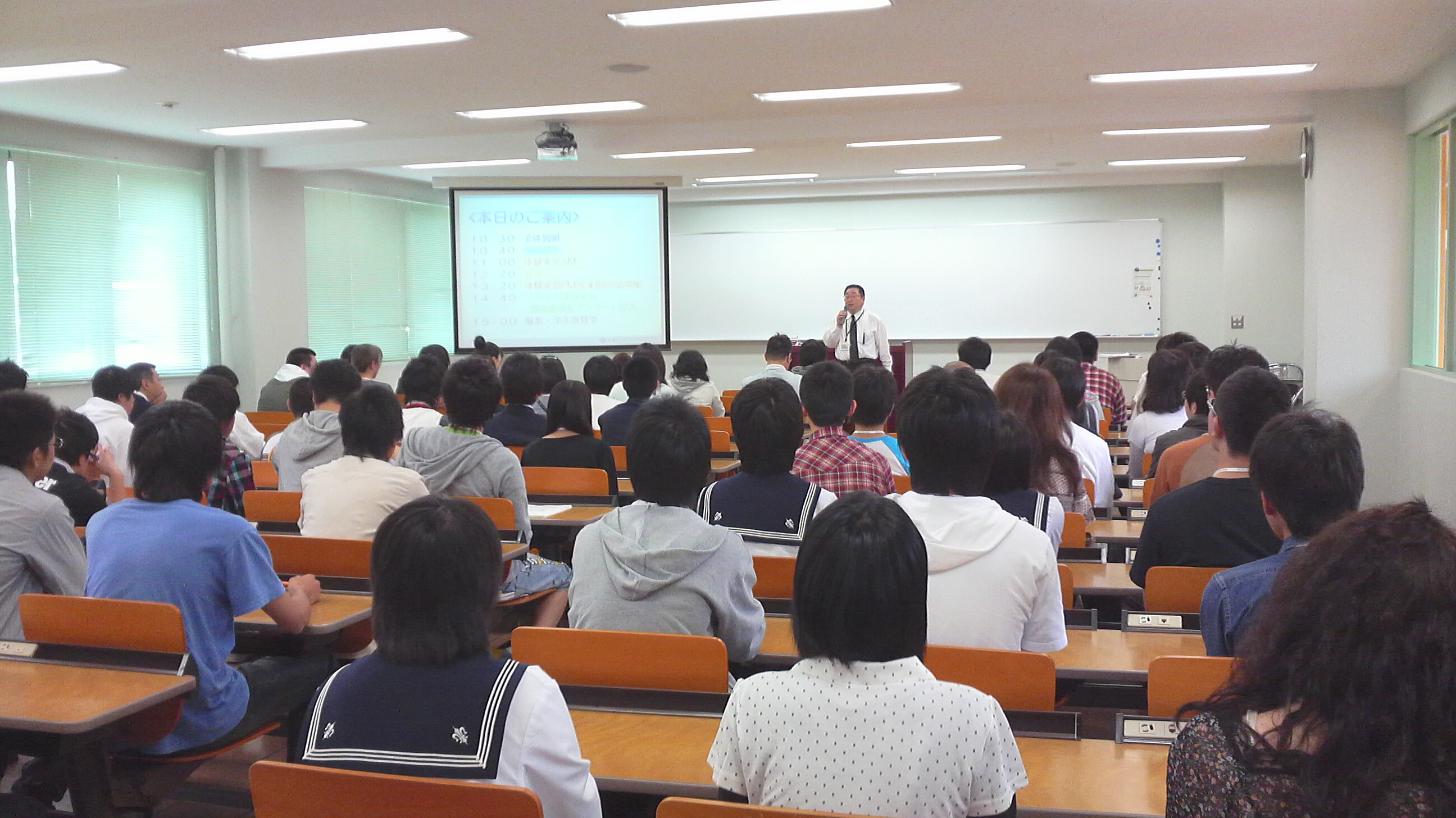 6月のオープンキャンパスが盛大に執り行われました。19日(土)と20日(日)の両日、午前と午後の二部ずつに分かれて行われました。左の写真は当日、各学科に分かれる前にPCラボ1で行われた全体説明の様子です。